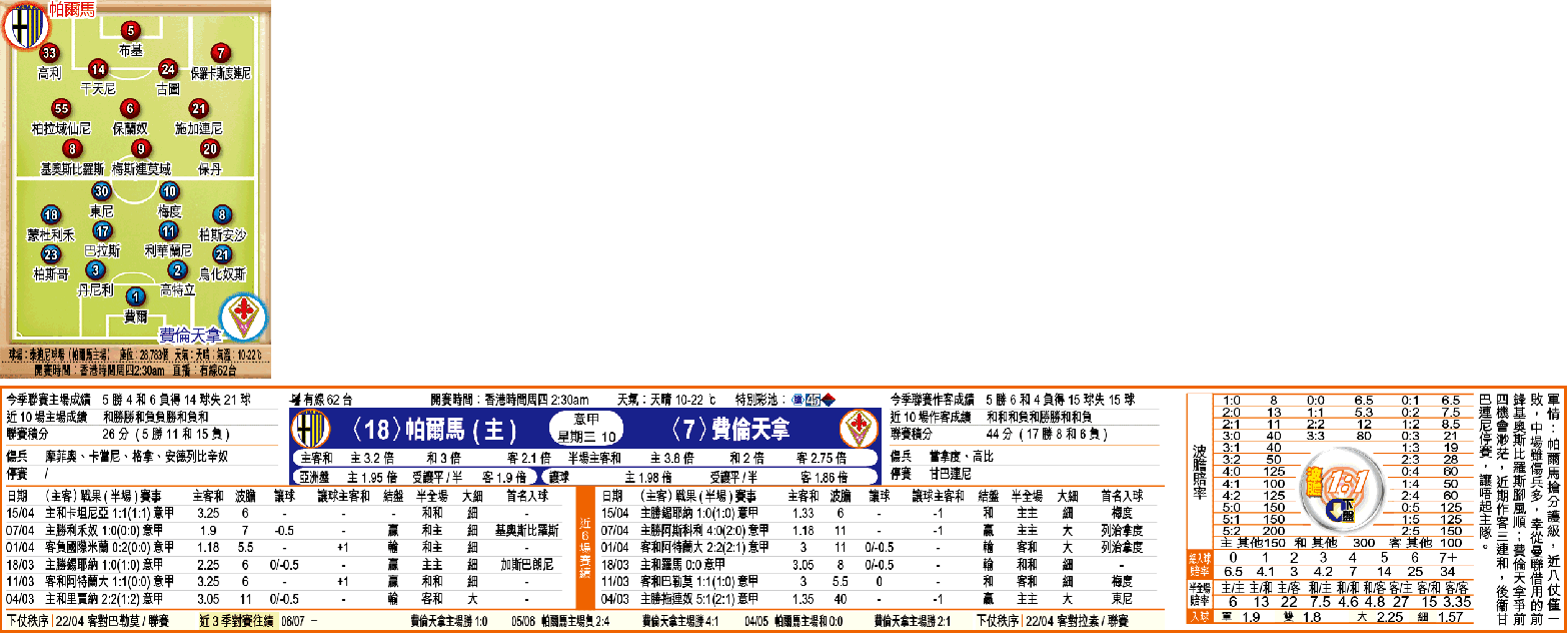 費倫天拿暫列第7,雖有爭入前4位踢歐聯的鬥志,但拉素與AC米蘭接連成功搶分,費倫機會已十分渺茫,球員難免有洩氣迹象;加上費倫上仗在打吡戰中,以寡敵眾下僅勝錫耶納1球,耗力甚多,而上仗領紅牌的後衞甘巴連尼,要停賽缺陣,令球隊後防呈不穩。加上費倫客場表現跌watt毛病未有改善,近3仗作客俱和波收場,實在難讓鬥志十足的帕爾馬;今仗除了可博下盤外,考慮雙方近期和波場次亦多,宜補3倍和波。