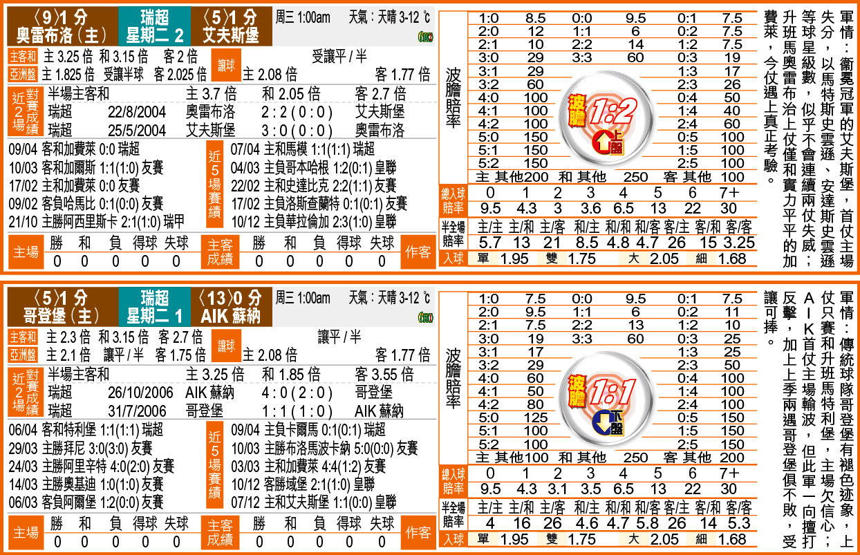 讓球:星期二1AIK蘇納(下)、星期二2艾夫斯堡(上)