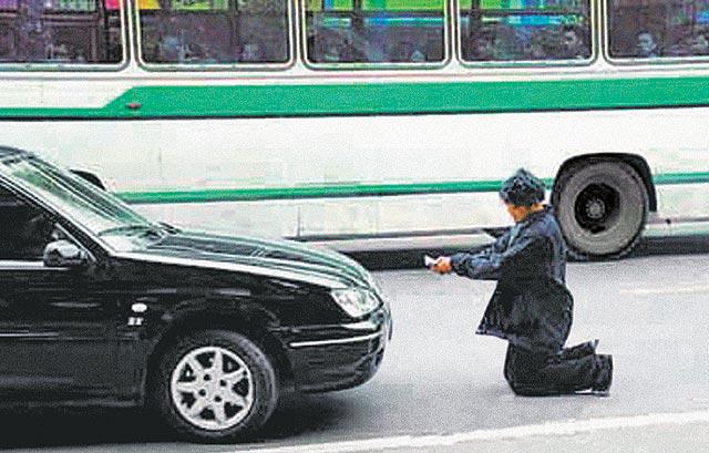 有乞丐不顧個人安全,竟跪在馬路中心,伸出雙手,攔車討錢,向駕車路過的司機行乞。