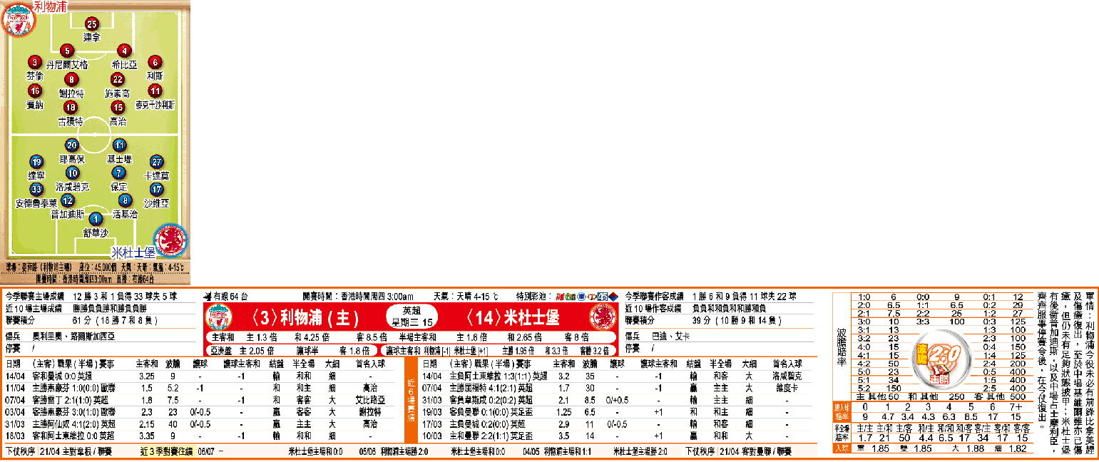 幾乎肯定奪來季歐聯資格的利物浦與中游的米杜士堡,在周三英超聯碰頭時可說是例行公事,不過由於利物浦實力在米杜士堡之上,加上主場表現有保證,「讓球主客和」利物浦[-1]宜捧「主勝」;再補入球開「雙」。(球賽編號:星期三15;有線64台明日3:00am直播)