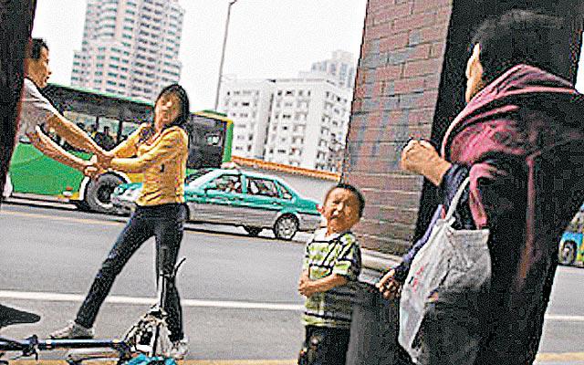 廣州一對夫婦日前上演街頭大戰!二人先是互摑、拉扯繼而拳打腳踢,全然不顧一旁幾歲大的兒子,已被嚇至啼哭不止。網民藍笨笨用手機拍下這對夫妻的醜態。其後,幸有路人斥責這對男女「你們怎能在孩子面前打架?」「這孩子可憐啊。你們怎麼當父母的!」兩夫妻終於停戰,在冷戰幾分鐘後,男的踩着單車,女的抱着兒子,一家三口一起回家了。 http://bbs.rednet.cn/1-2.dll?BoardID=10&ID=8007015
