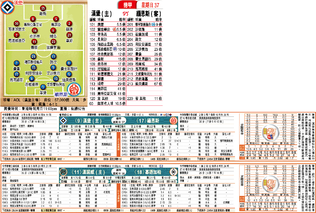 雖然漢堡仍傷兵滿營,像高柏尼、艾度巴及連赫特等都缺陣,但最近頻有入球的馬達維亞、奧歷及雲達華治都可披甲,有利他們爭勝。