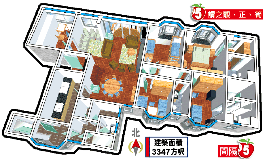 間隔:5房(雙套)3廳,另露台、冷氣機房、工作間、工人套房及貯物室