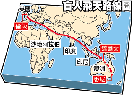 英國55歲冒險家希爾頓巴伯(MilesHilton-Barber),雙目失明,眼前漆黑一片。但他膽子大,駕駛超輕型飛機從英國橫渡澳洲。他先從倫敦出發,飛過中東、巴基斯坦、印度等地,現身處澳洲達爾文市,全程21,700公里的旅程終點,已經在望。他日內抵達悉尼後,即完成壯舉。