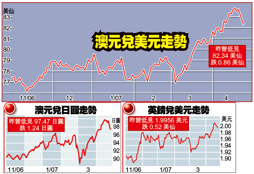 澳洲零售通脹降至兩年來低位,令澳洲儲備銀行下周加息的機會大打折扣,這股氣氛導致高息貨幣全線下挫,澳元昨一度急瀉逾1%,降至82美仙邊緣。另一高息貨幣紐元同樣受壓,一度在74美仙失守。但有外滙分析員表示,現階段仍不宜過份看淡澳元和紐元。