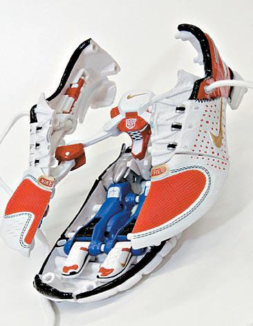 波鞋和機械人本來風馬牛不相及,其實可以合二為一(圖一)。日本Tomy玩具公司與運動用品商Nike合作推出奇特設計,一隻球鞋轉眼就變成威武機械人(圖二)──當然,這不是一般球鞋,而是尺碼小一半的塑膠版。波鞋機械人今日開始有售,定價2,625日圓(約173港元)。 路透社
