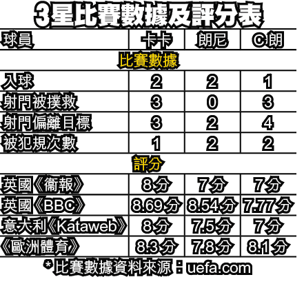 AC米蘭有很多輸波的理由,最重要是當C朗入球後專注個人表演時,曼聯卻有另一天才朗尼挽救球隊,而AC米蘭單箭頭基拿甸奴打足84分鐘卻沒有一次射門,卡卡的確有點孤掌難鳴。然而,儘管球隊首回合落敗,但從賽後部份歐洲傳媒的評分看(見附表),卡卡比朗尼和C朗的得分都要高。