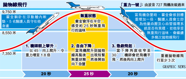 「重力一號」一般由高至低俯衝10至15次,讓乘客感受不同的重力狀態。根據程序,霍金會先下墜一次,身體沒有問題,就繼續下去。零重力公司行政總裁廸亞曼廸斯說:「如果他能一嘗25秒的無重狀態已算成功,試多次更難能可貴。」