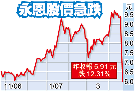 永恩去年純利只升14.5%,賺2.9億元,遜預期的16%,前日股價暴瀉28%,昨中午最低見4.88元,再挫28%;主席陳英杰陸續透過電話會議向基金經理解話,令午市跌幅收窄,收報5.91元,跌12.3%,但全日成交額達8.9億元,在十大成交榜排第6,僅次於建設銀行(939)。永恩現價等於06年市盈率33倍。