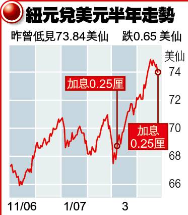 紐央行並指紐元處於「不合理」的高水平,言論惹起市場揣測央行或會出手壓低滙率。紐元在加息後曾升0.40美仙見74.89美仙,之後一度倒跌0.78美仙至73.71美仙。