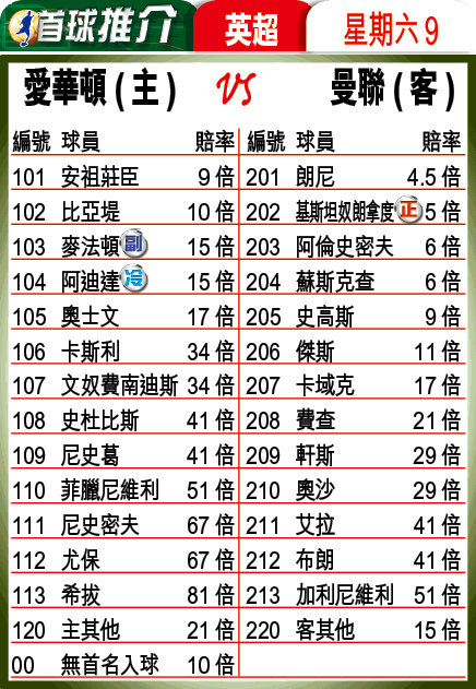 基斯坦奴朗拿度(C朗拿度)始終值得尊重,5倍可熱捧;主隊方面,近期腳風甚順的麥法頓和中場大腦阿廸達,各有15倍,是主隊最有機會先開紀錄的球員。