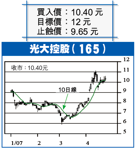 光大控股(165)昨收10.40元,升1.5%,股價於3月初守穩250日線後回升,3月底重越50日線,本月中旬升至11.12元高位回落,過去7個交易日力守10日線支持位,9RSI續見改善,但MACD背馳,日線圖過去兩日現「倒轉錘」及「陀螺」,成交顯著增加,下周可望延續強勢,向11.12元高位推進,破位目標12元。現價買入,以9.65元作止蝕位,留意MACD之變化,若見MACD開始轉好,成交增加,可加1注。