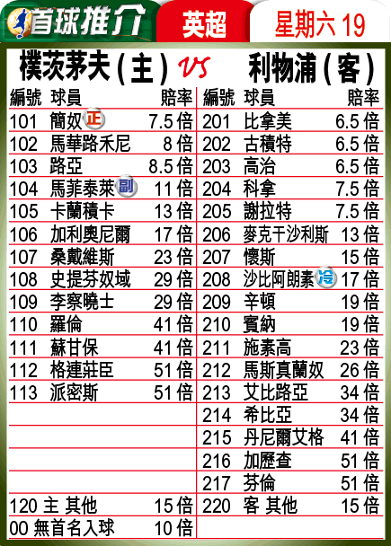樸茨茅夫前鋒簡奴勝在經驗好,「首球」正選;至於馬菲泰萊自從由後衞改踢中場後,時有入球,可作副。利物浦中場沙比阿朗素有遠射腳頭,宜冷敲。