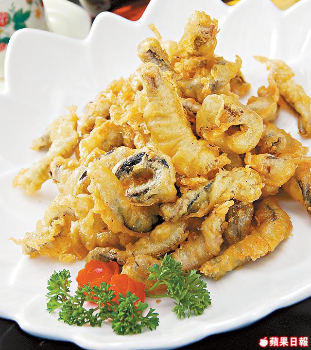做法:黃鱔去潺液後用熱水浸一浸,過冷河後切成3吋長,放入醃料醃5分鐘;麵糊料先攪勻炸粉和水,然後落油,再拌勻加芫荽碎。燒熱油至8成滾,將已沾上麵糊粉的黃鱔炸至亁身上碟,以番茄/生菜/小豆茴伴碟,灑上炒香芝麻。