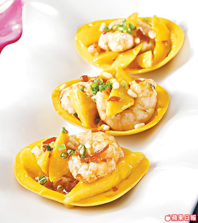 做法:蝦仁洗淨跟醃料拌勻;炒香蒜片/紅椒/亁辣椒,加入蝦仁,灒酒加調味/松子仁/芒果炒勻,用芒果皮盛載。