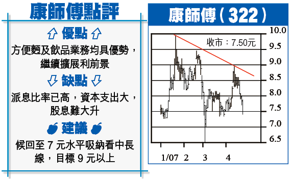 康師傅現價7.50元,PE(經調整減值後)32.6倍,息率2.5厘,PE已非低,只宜候低吸看中長線。