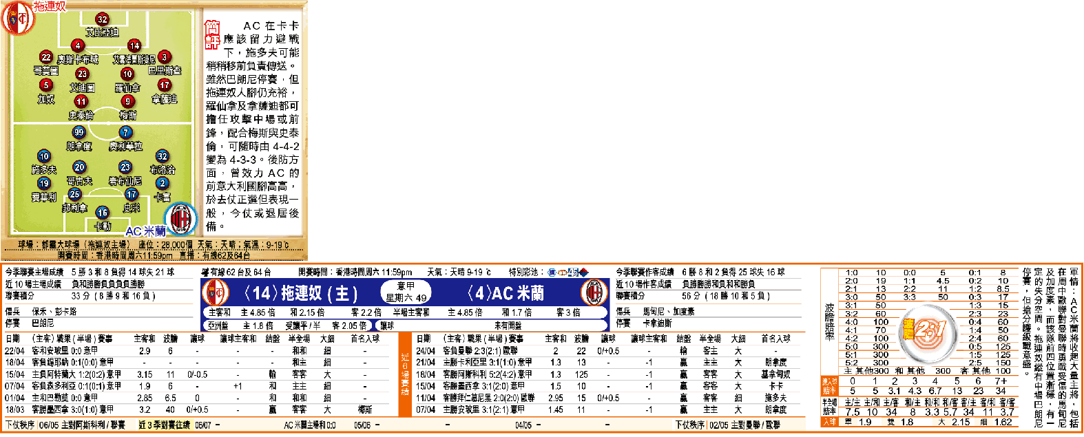 無疑拖連奴的攻力欠銳,但畢竟梅斯及史泰倫有一定質素,而前者於首循環如何連環施射令AC守將抹一額汗,可謂歷歷在目,今仗有能力攻破連續5場聯賽失守的AC防線。拖連奴贏戰意,而與其吼全日足智彩最熱、成棚人跟隨時中伏的2.15倍和波,不如小注拖連奴冷W。波膽方面,AC米蘭近仗不乏入球但又不時輸大意波,可向「大」膽埋手。