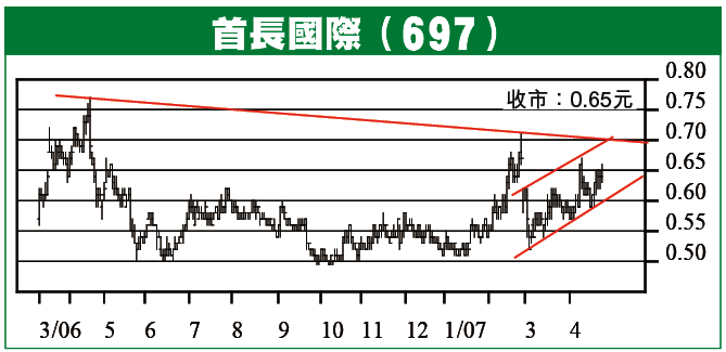 「走勢磨人、難炒到暈」係首長國際長期以來予散戶的感覺,故雖見該股踏入4月曾大成交急升至0.67元,但一高追即回落插穿0.6元,走勢蠱惑,但升軌總算已鋪開,可設止蝕位跟炒,料年內高位0.71元始終攻破,博爆升至1元範圍。