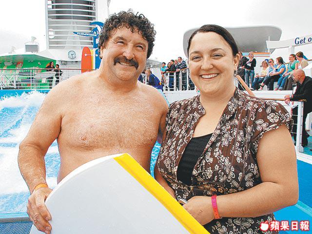 除了船長Young爆之外,Liberty的設施多,而且並不是單一只為情侶或上了年紀的人而設,反而有很多設施是為年輕人而設,好像滑浪、攀石、溜冰、卡拉OK等等,很適合鍾意扎扎跳的我。當日還見到來自Wales的Paul與女兒Amy,Paul見一班後生玩滑浪玩得興奮和投入,也忍不住來一班公開脫衣秀,看清楚一點,原來早已穿了泳褲在內,急不及待要試玩!問他何以在十多度的天氣下着泳褲呢?原來Paul哥早就知道世界超級郵輪上有滑浪設施,本身嗜水的他當然有備而來啦!除了Paul哥之外,在另一邊的牆角還見到Rebecca,這位來自Sweden的美女也是一早就知道Liberty上有現時郵輪最高的攀石場,有四十多呎高,約十層樓高左右,早就決定要試一試。Rebecca還提我記得去試溜冰和睇show!大家除了欣賞呢艘郵輪超級大之外,還非常熱衷船上超多的遊玩設施。