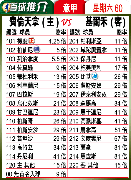梅度入球產量多,在東尼缺陣下以之熱選自然合理;柏仙尼的射術亦佳,機會亦不比梅度低太多。基爾禾的柏利斯亞勢成眾矢之的,不如留意後上建功不少的比基。