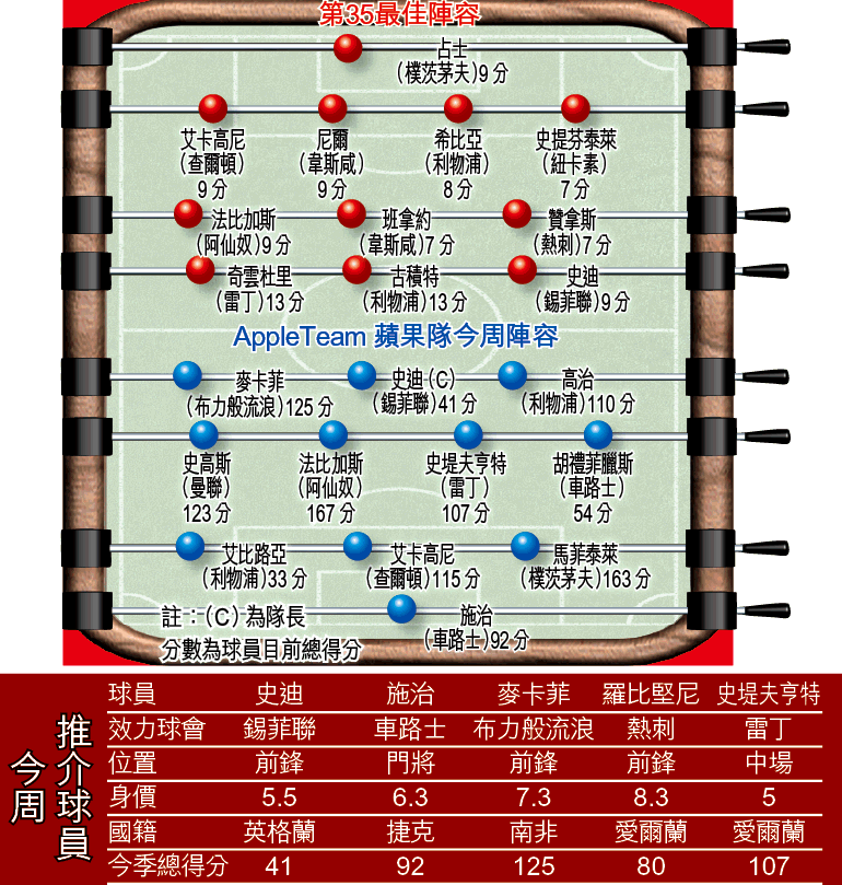 言歸正傳,今周焦點可能放在下游護級球隊搶分戰事,如錫菲聯鬥屈福特,韋根對韋斯咸,現時只有屈福特肯定降班,相信其他的都偏重進攻足球,寧願早搶3分「上岸」。錫菲聯近期表現一般,但前鋒史廸就最近兩場上陣都有入球,尤其上仗得到獎分,今仗遇上篤定降班的屈福特,有主場之利,肯定爭取更多入球。史廸身價為一直是5.5,短線投資1周合用。