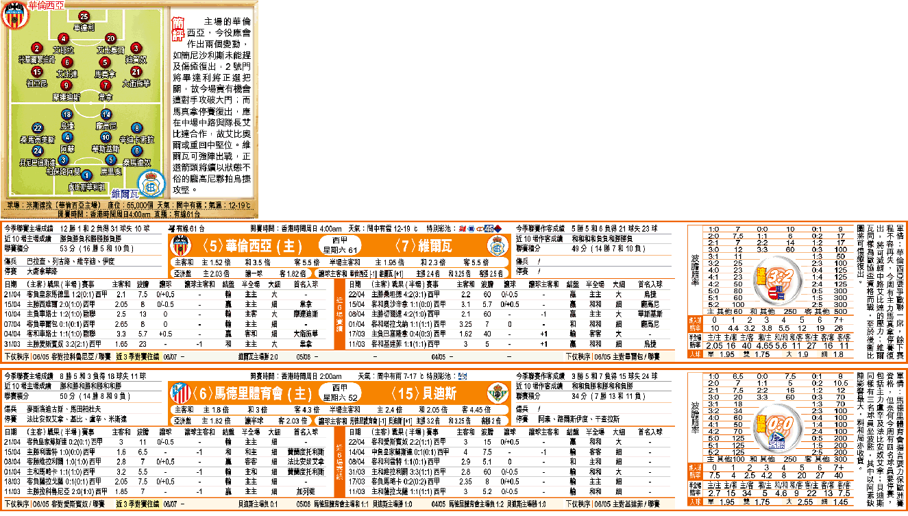 此外,華倫射手韋拿日前在記者會上表明,不會轉投車路士或祖雲達斯,並將於季尾與球隊續約7年,對軍心及士氣有一定幫助。何況今周有中場馬真拿停賽復出,祖亞昆亦傷癒可正選披甲;加上華倫近期在聯賽勝負盤路呈單跳,上仗剛負皇馬,依走勢輪到開W。
