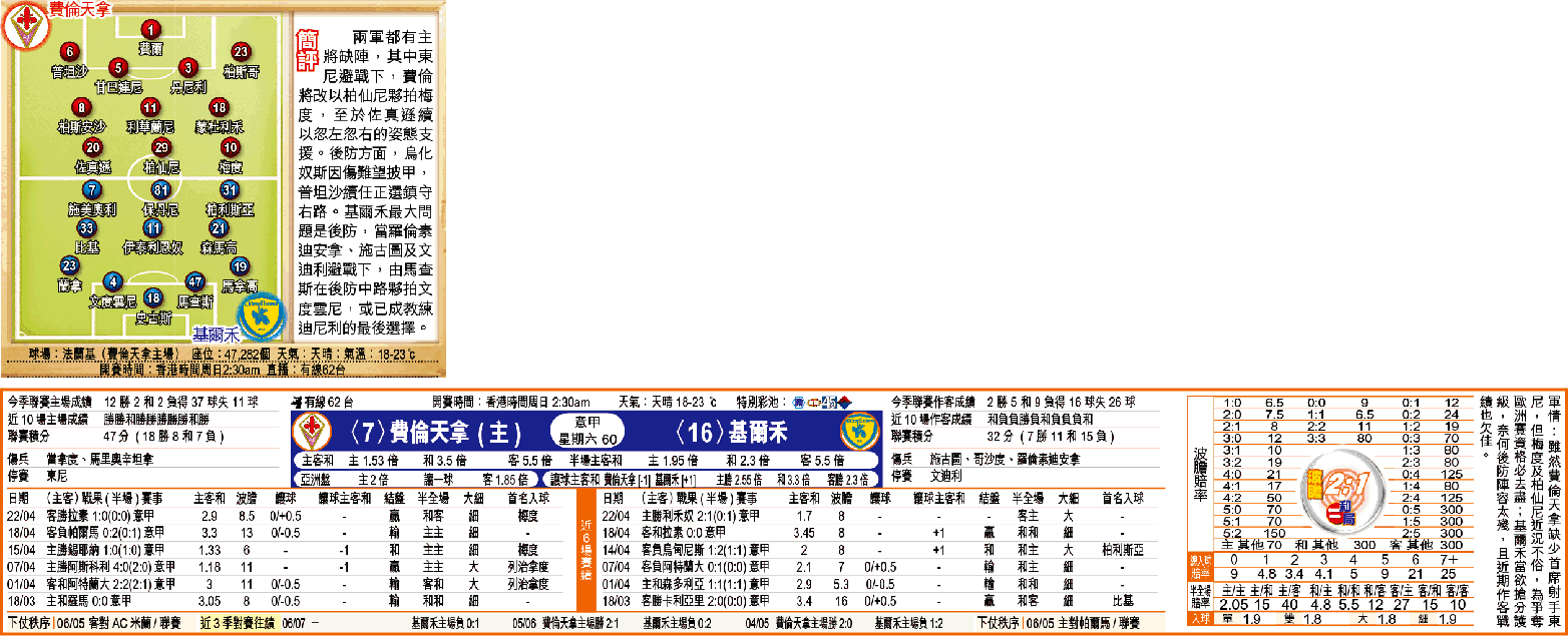 慘!慘!慘!所指是基爾禾周六作客費倫天拿的處境。雖說費倫天拿缺少東尼,但基爾禾後防陣殘,加上客績太差,料力戰僅敗,可直取3.3倍「和局」。(球賽編號:星期六60;有線62台明日2:30am直播)