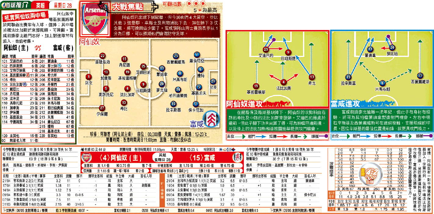 餘下3輪英超聯對阿仙奴雖然並不重要,但他們誓言以勝利來結束今個球季,故周日在超聯主場對訪前列隊多腳軟的富咸,捧「讓球主客和」阿仙奴[-1]的「主勝」,兼取入球「大」。(球賽編號:星期日28;有線63及64台今日11:00pm直播)青蛙仔