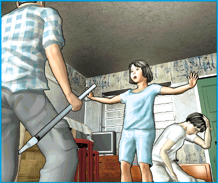 昨晨10時許,夫婦為洗衣問題發生口角,其間丈夫大發雷霆,當着三名年幼子女面前揮拳毆打妻子背部,再執起鋁製地拖棍狂打對方頭部,弄致地拖棍斷成兩截,妻子則前額受傷倒地飲泣。其中長女見狀大驚,恐怕母親會有危險,即奮不顧身走到母親身邊幫忙擋格,引致父親怒不可遏,猛力將她推撞埋牆,令長女當場撼穿前額流血。