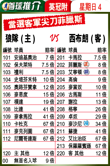今日貼士續重心推介英冠附加賽,狼隊主場迎戰西布朗;計整體實力客軍點都高啲,而且小弟在電視直播看過該隊如何在英足總盃作客3球打敗狼隊;翻查狼隊今屆聯賽主場賽績,23戰僅6敗,但當中一半敗仗係輸畀前6對手,有恐「強」症之慮,莊家開出平手盤,已知狼隊票數乏力,幸射手保夫萊特壓陣,可補一注「大」亦可,波膽取西布朗贏2:1、3:1。