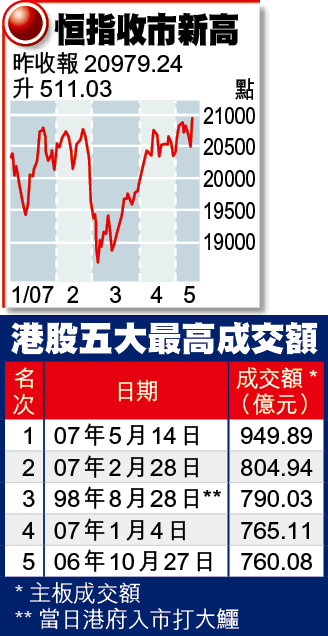 QDII565億元的投資港股額度憧憬,換來3700億元市值。QDII獲准投資港股,恒指一開波已裂口高開597點,距上周一單日歷史高位21070僅差5點,收市報20979.24,升511.03(2.50%),以點數計為6年來最大單日升幅。