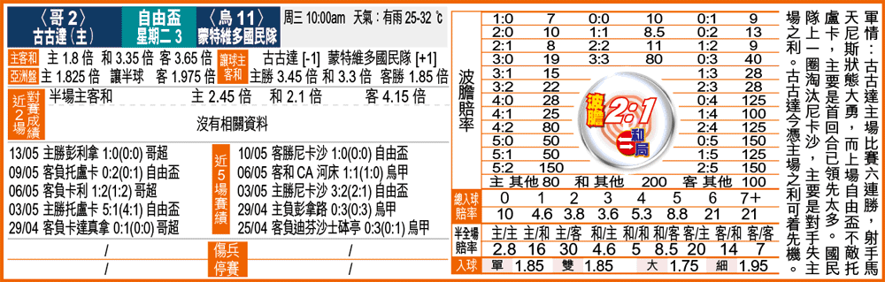 蒙特維多國民隊陣中只有少數現役烏拉圭國腳,像年僅21歲的守將哥甸,中場只靠前馬德里體育會球員馬些路蘇沙支撐,實力不見得較名不經傳的古古達好。既然古古達主場見水準,單注其1.8倍主W已屬理想選擇。(推介見賽績表)