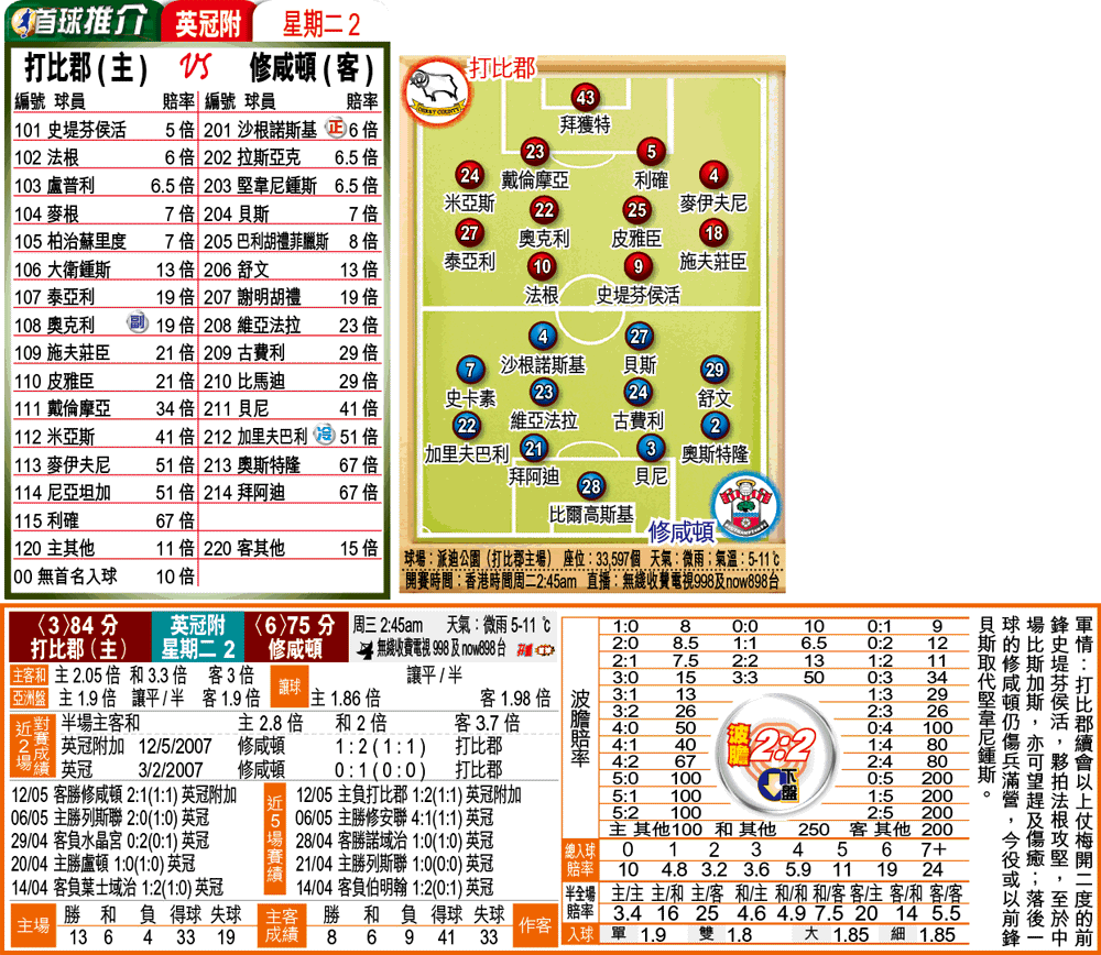 由於打比郡與修咸頓都是識入波的球隊,是役首選入球開「大」,有1.85倍;另外,更一定要補兩隊打和2:2的波膽(13倍),因為打比郡過去4次迎戰修咸頓,就有3次打和2:2。