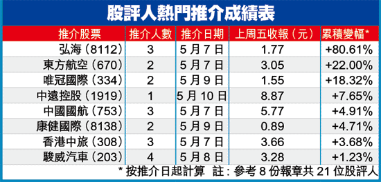 另外,市場憧憬新航將入股東方航空(670),有關談判經已進入最後階段,加上獲基金增持,刺激東航股價躍升22%;中國國航(753)首4個月載客量按年增長14%,亦可炒重組概念,帶動股價漲近5%。