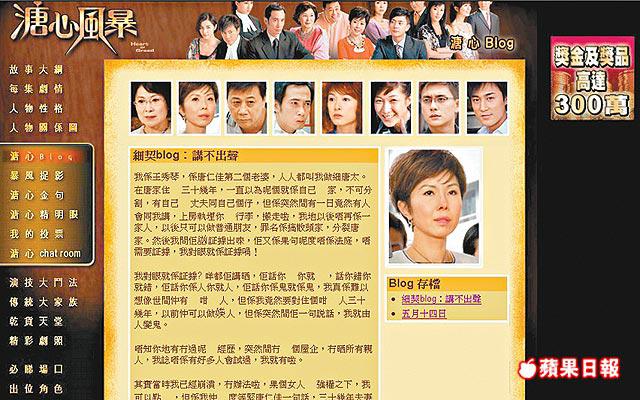 無綫劇《溏心風暴》劇情峯迴路轉,廣受觀眾歡迎,為配合劇集宣傳,無綫特地在www.tvb.com網頁內闢出「溏心dotcom」欄目,介紹劇情及精采片段,又讓劇中八位主要演員開blog談感受,其中以大契的blog最受歡迎。而細契在blog中自辯沒有做錯事,並怒罵大契生病是上天為她撐腰,有如劇集的延續,觀眾也相當入戲,竟留言以粗口罵她禽獸王。由本月21日開始,演員們更會於劇集播出後到chatroom講感受,並與觀眾聊天。