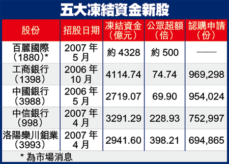 掀起全城抽新股熱潮的百麗集團(1880),消息人士指出,截至昨晚其公開發售倍數已約500倍,按公開發售金額僅8.66億股計算,凍結資金達4328億元,取代全球最大集資規模的工商銀行(1398),成為在本港進行招股、公開發售部份凍結資金之冠,很大機會上限定價。