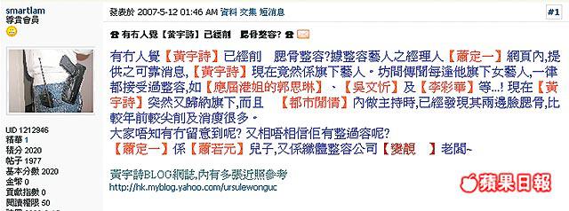 香港娛樂圈忽然吹起一片整容風,蕭定一旗下的整容兵團吳文忻、甄穎珊、陳樂榣及A貨祖兒譚情,個個都是經過大修的人造美女,郭思琳更借整容傳聞強攻港姐,可惜最後落選。近日網友smartlam又有新發現,去年加盟蕭定一旗下的黃宇詩,也被指有整容之嫌。