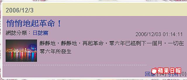 凌零發翻看了黃宇詩過去的網誌內容,發現她在去年12月3日的網誌上,竟寫上「靜靜地,靜靜地,再起革命。」一篇文章,至今年1月面容大變,一句革命,意思實在令人懷疑!