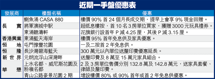 一手市場經過數月來吸納大批購買力後,市場焦點已轉移至號召力較低的貨尾盤,與及一些單幢新盤,令新盤銷情開始放緩。發展商為催谷貨尾,各師各法推優惠,其中長實(001)兩個貨尾盤,包括鰂魚涌CASA880及將軍澳城中駅,分別設長成交期及超低息優惠。至於受爭產風波影響的華懋集團,繼上水及粉嶺三樓盤後,旗下青山公路豪景花園,亦加添新優惠,以一口價及免息供發售40多個貨尾。