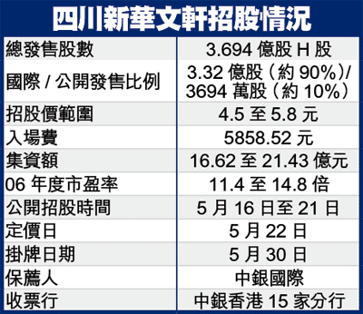 【本報訊】四川最大圖書零售商四川新華文軒(811),昨日舉行投資者推介會。消息指出,招股價介乎4.5至5.8元,總發售3.69股H股,按06年度純利計,市盈率介乎11.4至14.8倍,連同手續費的入場費約5858.52元,將於明日起公開招股。保薦人為中銀國際。