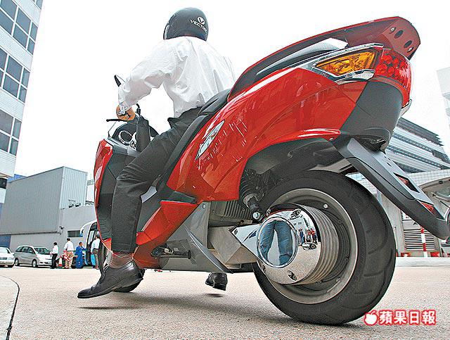 【本報訊】香港生產力促進局昨日舉行混合動力及純電力汽車技術研討會,並展示一系列最新款環保汽車;全場最矚目是剛於本月初在歐洲發售的純電力環保電單車Vectrix,火紅的外殼,吸引會場人士圍觀。 負責研發該電單車電池的超霸科技(香港)有限公司營運經理姚啓文表示,Vectrix是全球首部獲准在歐洲高速公路行駛的純電力電單車,由起步至時速80公里只需4秒,最高時速可達120公里,現售11,000歐元(折合港幣約116,000元),現積極研究引入本港。