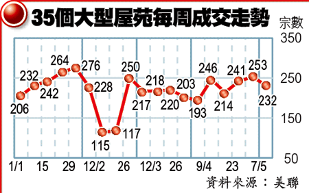 雖然一手交投稍見放緩,但二手市場交投則保持穩定,不少向隅新盤買家,亦逐漸回流二手市場。美聯首席分析師劉嘉輝表示,全港35個二手屋苑,上周錄得232宗成交,雖然較前周253宗減少8.3%,但仍能維持連續5周逾200宗水平,重現首季1月及3月份二手獨旺的局面。他預期,由於市場焦點重投二手市場,交投將進一步增加,料5月份整體二手買賣可逾7000宗,與4月相若。