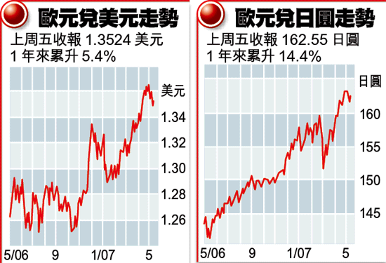 歐元兌美元於上月27日攀上1.3680高峯,雖然於上周五已回吐至1.3524,但過去12個月仍累升5.4%。歐元兌日圓升勢更凌厲,在本月3日曾衝上163.60的紀錄高位,上周五雖稍為回順至162.55,但過去一年累計仍勁揚14.4%。