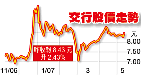 《路透社》昨天引述中信建投金融分析師佘閔華說,只要市場並不過熱,交行今天的合理價值將介乎11至12元;國泰君安證券分析師伍永剛指出,就交行業績而言,12元左右應該有支持。交行H股昨天收市報8.43港元,升2.43%。