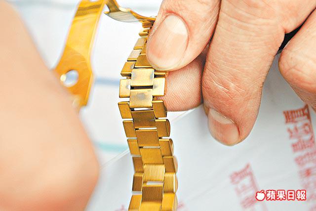 「他(導遊)說這個錶是純瑞士的,你就把這隻錶給砸碎,它也不會掉顏色,但現在就掉了。他告訴我們這是鑽石錶,我們回家到鑽石場驗,這是很普通的一種石頭。」他展示其中一隻所謂鑽石錶,錶帶已有脫色現象。