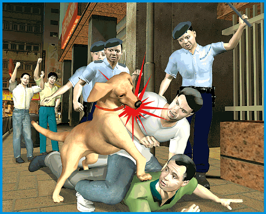 突然間,有人解開狗帶及向唐狗發施命令「咬佢!咬佢!」唐狗即時衝向警員,一名便裝警員閃避不及右手臂被噬傷,其他警員即時拔出警棍揮舞,阻嚇唐狗接近。