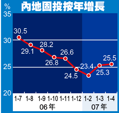【本報訊】國家統計局昨公布,首4個月城鎮固定資產投資增長25.5%,較首季25.3%高。人民銀行行長周小川昨日在上海表示,為了抑制通脹,保證經濟平穩增長,不排除加息及上調存款準備金率。雖然固投增幅回升,但內地證券界人士認為,市場已對加息有心理準備,故昨日滬深股市只曾微跌,便掉頭回升,其中滬深300及深綜指數均創新高。