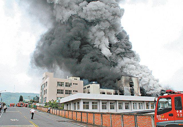台灣南投市南崗工業區一間化學工廠的鍋爐昨清晨爆炸,引起大火,幸無人傷亡。由於廠房內儲存逾百桶、合共40多噸的有毒化學物品,消防員參與灌救外(圖一),環保署與軍方都派員協助。