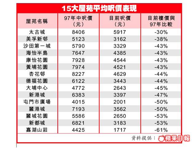 累積多年升幅,中小型住宅整體樓價升幅仍未追上97年水平,黃建業預測,若樓價每年上升10-15%,5至7年內將可重上97年水平。其中以藍籌屋苑的潛力較高,例如太古城、美孚新邨、沙田第一城等的抗跌力及升值能力較佳。