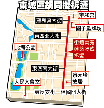 而在公示拆遷區域內或者附近,存在着眾多具有文物保護價值的古建築,如雍和宮、國子監牌坊、蔡元培故居,以及不少掛牌保護的四合院。東城文管所所長李僅錄說,已向市文物局申報該項目所涉及區域文物保護點的清單,有關拆遷具體涉及哪些胡同和四合院,暫沒有定論,正在協商中。據悉,這次擬被拆遷的胡同許多在1999年被市政府列入保護區範圍。